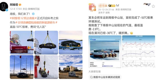 点击上方↑“电动智家”关注,记得加☆“星”!据电动知乎报道,阿维塔官方微博12月8日宣布,旗下阿维塔12车型已抵达南极中山站,成为“全球首款登陆南极的新能源汽车”,并宣布将“面对-50℃极寒,勇敢进入‘无人区’”。不过,这样的宣传很快引起了网友的质疑。重点是,目前南半球正值夏季,南极中山站的实际气温甚至比同期北京还要高。面对质疑,阿维塔24日回应称,阿维塔12号将跟随中国极地科考队在南极停留至2027年4月,进行为期16个多月的适应性测试,期间将经历各种极地季节和环境变化。 Avita承认之前的宣传并没有完全退出明确测试的持续时间,这“可能会导致一些误解”。面对越来越多的质疑,阿维塔相关负责人24日接受经济参考报采访时解释称,此次航行与中国极地科考船“雪龙”号的航行计划紧密相连。今年11月出发,12月7日抵达南极中山站。负责人强调,由于科考任务配置,抵达时间恰逢南极夏季,但车辆短时间内不会返回。阿维塔12号将跟随中国极地科考队在南极停留至2027年4月,开始为期16个多月的适应性测试。艾薇塔官方微博24日也更新了其声明,仅提及“16个月的极地测试”、“技术验证”等内容。此前“面临-50℃极寒”的说法没有再出现。 Avita表示理解公众对信息透明度的担忧,并表示近期将通过官方平台发布更多详细信息。