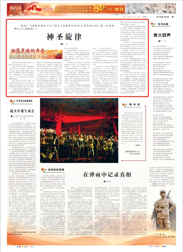 “起床!人们不想成为奴隶!” “志愿军队的游行”在反对战争的战争中出生,每次唱歌时,它都会使人们感到高兴 - 神圣的旋律■“志愿军队的游行”,都会和平地在“五颜六色的云云”中,带有美丽的山脉和河流和河流。在戴安奇湖(Dianchi Lake)的河岸和西山的山区中,尼尔(Nie'er)的坟墓被古老的树木悄悄地包围。在墓地前,尼尔(Nie Er)的白色大理石雕像站着。她穿着一件风衣,稍微mo吟,好像她怀有新任务。盯着墓碑中的九个大词“人民的坟墓”,热情的旋律似乎在我耳边尖叫。尼尔(Nie Er)于1912年2月出生于昆明。在中国旧的中国长大,伟大的大国(Binu -Bully),见证了破碎的山和伊洛格(Ilog)以及人民的痛苦,他决心将音乐用作武器来激发社交觉醒。他对音乐的梦想非常紧密从一开始就归功于该国的命运。走到坟墓旁边的尼尔纪念馆,一张小提琴的古老照片吸引了我的注意。棕色油漆是斑驳的,面板略微破裂,脖子有点累,但仍然可以看出钢琴的质量很好。根据Nie Er的日记,这是他在1931年在上海购买的第二次小提琴。根据导游的说法,Nie Er在1935年创建了“志愿者March March of Nie Nie of Nie of Nie”时使用了这款小提琴。1932年,Nie Er和Tian Han在上海相识。天汉回忆说:“尼尔是一个有音乐才华的年轻人,他很少爱国。”因此,天汉介绍了尼尔(Nie)加入中国的党社区主义者。他们与诸如“前锋之歌”和“毕业之歌”之类的伟大作品合作。在那个黑暗的季节中,这些作品就像闪电般的夜空,解释了人们勇敢地战斗的道路。其中,最受欢迎的是“志愿者游行”。 1935年,天汉奉献他自己创作了反日本和民族宣传电影《儿子和云》,但不幸的是,一旦他写了这个故事的摘要,就被捕了。继续创作的西亚·扬(Xia Yan)来到了导演桑希(Sun Shiyi),碰巧遇到了尼尔(Nie Er)。尼尔强烈问:“我听说“暴风雨与云”的结尾有一首主题曲?将作品留给我,我会做的。”在Xia Yan讲话之前,Nie Er紧紧握住她的手,重复:“我会做!她几乎忘了白天和黑夜吃饭和睡觉,有时会砸碎桌子,有时坐在钢琴前弹钢琴前,有时会在地板上行走,有时……尼尔改变了原始歌词的末端,“很少有敌人的敌人炮兵!”田韩评论说。我们不惧怕暴力或牺牲,我们向前迈进,向前迈进,使国家免于危险。这些音节似乎很简单,但它们在抵抗战争中表达了军事和平民的声音。在后来的“中国国家”中,含义的是,在中国的“中国国家”的含义中,含义是“危险的”国家。天汉和尼尔(Tian Han)和尼尔(Nie Er)用笔和歌曲作为“暴风雨和云儿童”的角色写了一个永恒的经典作品,志愿者迅速散布,播放最强烈的声音,以拯救新的游行,就像一条新的河流一样,遭受了阵阵阵阵阵阵阵阵阵阵阵阵阵容。勇敢的文学和艺术是音乐...音乐只是大学对于所有人来说,诸如血液流动的人。“著名的文化艺术家冯齐凯(Feng Zikai)在“与日本的战争之歌”中写道:“当沿途留下来时,反日本战争的歌曲可以唱《中国民族》是最危险的时代。 “冯·齐卡(Feng Zikai)的回声帐户是对著名记者爱泼斯坦的纪念。1938年,当泰尔祖(Taierzhuang)的胜利取得了巨大的成功时,当他目睹中国官员和士兵们唱歌“自愿游行”时,他感到惊讶,并指控日本炮火,并向日本炮火指控。在第二次世界大战结束的前夕,“志愿者的游行”被选为反法西斯主义盟友。 1949年9月,中国人民政治会议的第一次全体会议被称为“志愿者的三月”作为国歌。 10月1日,在成立仪式上,雄伟的梅洛蒂安曼广场(Tiananmen Square)响起“志愿者游行”。 1982年12月,中华人民共和国第五届国民大会的第五届全体会议决定,“志愿者游行”是中华人民共和国的国歌。 “起床!人们不想成为奴隶!”这是每个儿子和女儿心中的神圣旋律。在战争或和平期间,无论山脉和河流高什么,无论何时和河流都很光滑,无论何时何地,河流都很光滑,它总是会让MGA人感到惊讶并带来力量。这是持续很长时间的艺术经典,它是融入血统的精神基因。 “志愿者的三月”手稿,长城,反日本和国家救援运动所写的纪念诗,以及田(Tian Han)……更仔细地看着Nie Er的坟墓后面宏伟的大墙,场景击中了灵魂。 Nie'er公墓,形状像个星期一Th。在坟墓前是7个花环,又有一个隐喻的尺度。秋天的风沙沙作响,激怒了森林的叶子。当我告别西山时,我再次转过身,在坟墓闪闪发光,红色和眼花azz乱的坟墓前看到了一个五星级的红旗。熟悉的旋律再次响起我的耳朵,在世界上,看起来像是金色的笔记击败了...