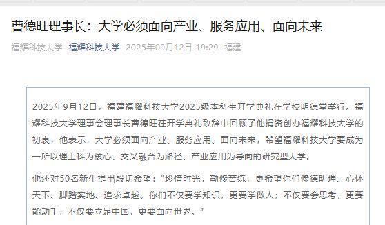 2025年9月12日,在2025年福建科学技术大学的本科生开幕典礼(因此称为“科学技术大学”)在学校的Mingde Hall举行。富雅科学技术大学董事会主席曹Dewang在开幕式上的讲话中,研究了他最初的意图,以提供促进富雅科学技术大学的资金。他说,该大学应针对行业,服务应用和未来,并希望富雅科学技术大学将成为一所研究大学,其科学和工程学是主要的,跨集成的道路,并且是定向的工业应用。科学技术的官方微博屏幕截图Cao Dewang表示,在此过程中,企业家精神沿途,他深刻意识到该行业是一个国家的基础,教育是一种一个强大的国家的基础。没有才华,没有改变;没有教育,就没有未来。 Cao Dewang回忆说,2009年,他参加了达沃斯论坛,并听到许多外国专家说:“中国学生擅长测试,但缺乏手工能力和批判性思维。”这句话使他很长一段时间都不平静。 2014年,当Cao Dewang进入代顿投资区时,他用自己的眼睛看到了代顿大学如何与通用电气和艾默生(Emerson)等公司一起工作,以将教室搬到实验室,并在前线劳动线上建造实验室。 “在那一刻,我了解教育不应从真理中分离。大学应该专注于行业,服务和应用以及将来。”为了建造学校,曹武说,他几乎每天早晨都到达建筑工地,以了解发展和质量。在不到两年的时间内,一个现代校园拥有一个区域F建筑860,000平方米,面积为1,0860,000平方米。 “但这仅仅是一个开始。真正的好大学不在建筑物中,而是在老师中发展出伟大的爱和伟大的模式。” Cao Dewang说。他还向50名新生表达了他的诚挚希望:“热爱时间,努力,并希望您发展美德和真理,即使在世界心脏中,甚至在世界心脏中,保持脚踏实地并继续。您不仅应该知道知识,而且还知道是一个人;您只是在世界上介绍了世界。王·舒古(Wang Shuguo)的本科生学习福建科学技术大学,以“如何成为一个负责任的人”为主题。“在了解以前的知识和经验的同时,它们必须打破付出的现有界限。在这个美好的时光,提前站在更改和探索的时间内。演讲的前面经文积累和知识渊博的是基于福雅科学和技术大学的官方网站,科学技术的官方网站位于104号,Zhihui avuiare,fue avui avui avui avui avui avui avui avui avu avui avui avu avui avui avu avui avu avu avu avui avu avu avu ave ,, fuui avu a ave ,, fuui avue ,,省覆盖671,120.1平方米(约1,006.68公顷研究生教育。富雅科学技术大学的综合微信ID,福雅科学技术大学的官方网站