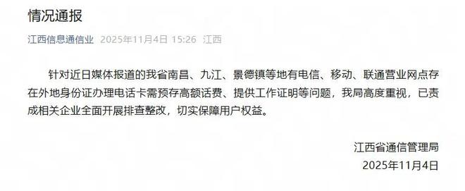 图为情况报告截图。针对近期有媒体报道我省南昌、九江、景德镇等地电信、移动、联通营业网点在用境外身份证办理电话卡时存在预押金高、工作证明等问题,我局对此高度重视,已安排相关业务全面排查整改,切实保障用户权益。江西省通信管理局此前于2025年11月4日报道,记者实际措施:多地申请电话卡需要工作证明、无犯罪记录、银行流水单。 “我想在南昌办理电话卡,但营业厅说需要无犯罪记录证明,这有意义吗?”近日,有消费者反映,在办理线下电话卡时,电信营业厅一些网点要求他们提供额外的证明材料,有的还要求预存数千元不等的话费。记者对多个城市的移动、联通、电信线下营业厅的办卡业务进行了实测,发现其评价标准差异较大,有的市营业厅只要求携带身份证即可办卡,有的则要求提供“犯罪证明”、“工作证明”、“银行流水单”等其中一项。更重要的是,他们要求预存500至1000元的电话费,并检查你的房产证或营业执照。为什么申请卡有这么多要求?多家营业部工作人员解释称,这是为了应对反欺诈要求,但具体依据的规定尚不清楚。工业和信息化部通信和信息化司科员刘兴良n科技委在文件中表示,运营商需要进行姓名验证、个人处理、实人验证等,《规定》明确允许运营商在其他领域办卡时也可以提出这样的要求。如果经营者在必要条件的情况下提出附加条件,且没有当地法规依据,其合法性值得怀疑。记者对多家运营商的办卡进行了实际业务测试,发现该地区不少营业网点在其他地区办卡的门槛存在明显差异。江西多地“提高”江西多地办卡门槛。在“境外身份证办理新电话卡”的基础上,记者在江西、福建、甘肃、黑龙江等地的10个营业网点进行了实际电话测试。他们发现,不同地区的评估标准差异很大。其中,第江西多地办卡门槛大幅“提高”。江西景德镇中国移动线下营业厅的工作人员表示,线下办理外国人身份证,需要提供以下任何一项:就业证明、营业执照、房产证、房屋租赁合同,并需缴纳500元押金。若材料不齐全,可联系区域经理前来申请。此时物质要求放宽,只需确认在当地居住或创业即可。该工作人员表示,此举是为了提高办卡门槛,防止电信网络诈骗,防止流动工作人员办卡后在其他地区实施犯罪行为。这种要求并非景德镇独有。江西其他城市对于其他地区的办卡也同样严格。中国联通和电信也执行同一标准,并按有关规定执行。景德镇另一家中国电信线下营业厅的工作人员表示,办理国外身份证,只需携带身份证到现场即可,无需提供就业证明、无犯罪证明等额外材料。但无论选择哪种套餐,都需要预付500元押金。通通和中国移动对于申请国外身份证也有类似的预存款要求。江西省九江市中国联通线下营业厅的工作人员询问了记者身份证的位置,并澄清,由于防治电信诈骗,任何就业证明、营业执照或居住证明都需要在境外身份证上办理进一步手续。如果您打算开店,提供营业执照即可,无需其他附加材料;在同时需要预存话费,金额根据套餐而定,最低100元。证明材料和预存电话费是强制性要求。当记者表示“营业执照、就业证、居住证不予办理”时,工作人员回应称“线下营业厅可能不办理”,并确认“线上申请不需要额外证明材料,可以直接下单,与线下要求不同”。相比之下,福建、甘肃、黑龙江等mga地区的其他地区办卡门槛则相当宽敞。福建泉州的中国移动工作人员表示,用本地身份证和外地身份证办卡没有区别。您只需携带身份证并按照套餐充值即可,无需再提供证明;甘肃兰州联通只需o “口头确认不打营销电话,并证明您名下卡数不超标”,无需预存款;黑龙江哈尔滨中国电信要求定期存款100元,只需要你的身份证。工作人员指出,“之前还有额外的审核要求,但现在已经取消了”。此外,我们发现,即使拥有本地户籍,在江西部分地点电信营业厅办理电话卡时,仍需提供在职证明、安全审查证明、无犯罪记录证明、银行流水单等。有消费者在相关平台投诉称,在其他地方办卡之前也遇到过类似情况。不少工作人员称此次严格的“反舞弊”审查,但政策依据尚不清楚。为什么申请卡的要求不同?许多营业厅工作人员解释原因为“落实反舞弊工作”。记者进一步询问了该运营商在多个城市的客服情况。记者拨打了江西南昌市3家运营商的客服电话。中国电信客服明确表示,“针对反诈骗投诉,要求用户提供无犯罪记录证明、就业证明或银行对账单入网(办卡),具体以营业厅为准。”当记者询问具体依据是什么规定时,对方表示,“我没有看到详细的文件”。不过,南昌一家线下联通营业厅的工作人员表示,只需携带身份证即可直接申请新号码。南昌联通客服表示,没有看到具体规定,会记录评论;南昌移动客服称外国人只办卡需要身份证,没有其他证明的就可以。记者注意到,运营商客服和线下营业厅的具体要求也可能不一致。例如,上述南昌电信客服在办卡时需要提供相关证明。不过,当记者随机拨打南昌市多家电信营业厅的电话时,工作人员表示,即使是外地人办卡,也只需要身份证,不需要其他材料。上述规定是否合理?针对多地要求的“无犯罪记录证明”,记者分析《关于完善和规范公安派出所发放证明的意见》发现,该证明仅适用于“接受高等教育、服现役、就业”等法定条件,电话卡在其他领域的应用