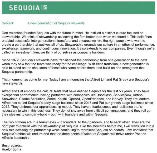 美国红杉资本掌门人突然“被解雇”……近日,担任红杉资本掌门人仅三年多的Roelof Botha宣布辞去高级管家职务,由Alfred Lin和Pat Grady继任,共同管理红杉资本。 52岁的博塔在公开信中表示,他将像以前的经理一样,转向为自己投资的初创公司提供咨询服务,同时继续代表红杉资本进入董事会。 52岁的博塔发表公开信,突然辞职引起PAM圈广泛关注。 美国投资。最新消息显示,Botha已被三位高级合伙人出柜。一位内部人士称风暴是对博塔执政党的“反抗”风格。他说:“博塔的智商确实高得离谱……但主要问题是他总是被认为是房间里最聪明的人。与此同时,他的情商与他的智力并不匹配。”公开资料显示,红杉资本是1972年创立于美国硅谷的知名风险投资公司,公司在美国、中国、印度等地拥有本土化基金。作为第一家机构投资者,投资了苹果、谷歌、思科、甲骨文、雅虎、LinkedIn等创新科技公司。其中国基金成立于2005年,由沉南鹏和红杉资本共同创立。 Nit将专注于科技/媒体、医疗健康、消费品/服务和工业技术领域。其联合投资包括阿里巴巴、京东、滴滴出行、拼多多等500多家公司。红杉资本掌门人罗洛夫·博塔突然陷入“信任危机”。的h红杉资本负责人被解雇。据英国《金融时报》报道,多位知情人士透露,由于对Botha的管理风格、红杉资本的AI投资策略的质疑,以及多起高层公开怀孕事件,林俊瑞、帕特·格雷迪和安德鲁·里德对此事进行了干预。这三位高级合伙人得到了更广泛的内部成员和红杉资本前管理合伙人道格·莱昂内(Doug Leone)的支持。据悉,三位代表使用的是natataSequoia的治理结构,该结构允许合作伙伴随时发起领导力投票。该制度赋予更多高级投资者更高的投票权重,旨在防止高级合伙人阻碍低级投资者的晋升。接下来,林俊瑞和帕特·格雷迪将接管公司的运营,里德和格雷迪将接替并监督红杉资本对成长阶段初创公司的融资。博塔开始管理红杉的美国和欧洲业务2017 年担任管理合伙人,并于 2022 年成为管理合伙人。他的主要投资包括 Instagram、YouTube 和数据库管理公司 MongoDB。据知情人士透露,自2017年以来,红杉资本已向美国和欧洲的合作伙伴返还超过500亿美元。尽管取得了这些成功,但合伙人认为,投资了 Openai、Airbnb 和 Doordash 的林俊瑞以及支持 Snowflake、Zoom 和 ServiceNow 的 Grady 更适合带领红杉前进。管理和文化上的摩擦是引发这场“叛乱”的主要因素。据《福布斯》报道,红杉资本正面临LPS的质疑。今年夏天,有消息称其合伙人肖恩·马奎尔在社交媒体上对纽约市长候选人佐兰·马姆达尼发表了攻击性言论。博塔选择捍卫伴侣的“言论自由”权利,而不是发表正式道歉。结果,虔诚的穆斯林首席运营官苏迈亚·巴尔巴莱(Sumaiya Balbale)愤怒辞职,海湾投资者开始质疑红杉资本的价值观和企业文化。美国许多公共捐赠基金和大学重新考虑对红杉资本的投资,称支持一家允许“这种偏见”的公司与他们遵循的道德投资框架相矛盾。红杉资本负责人被解雇,公司进入“双讲者”模式,加大对AI的投资。此时红杉提拔的两位新领导者是林俊瑞和帕特·格雷迪。其中一位曾长期负责红杉资本的早期投资,投资过OpenAi、Airbnb、Doordash等多家独角兽公司。其他负责成长期投资,投资过Snowflake、Zoom、ServiceNow等多个知名项目。林俊瑞1972年出生于中国台湾,6岁随父母来到美国,分别毕业于哈佛大学和斯坦福大学,获得学士和硕士学位。是在加入红杉资本之前,林俊杰不仅创办了自己的公司,还创办了自己的投资公司,并拥有丰富的投后管理经验。 2010年,林俊瑞加入红杉资本,主导投资了多个明星项目,包括Airbnb、Uber、Doordash、OpenAi(与Pat Grady和Sonya Huang联合领投)、Reddit、Citadel证券(城堡证券)等。红杉资本的另一位联席负责人Pat Grady是一位年轻的“年轻人”,2007年24岁加入红杉,一直负责成长期(B+)的投资。他长期主导并参与了医疗领域的ServiceNow、OpenAi、Snowflake、Zoom、Legal Ai Harvey、Notion、Chatgpt OpenEvidence等公司的投资。 知情人士表示,红杉资本接下来将加大对AI的投资力度,而在博塔任职期间,红杉资本对于人工智能的投资则显得较为谨慎。例如,2021年,红杉资本只向OpenAi投资了约2000万美元,当时的估值约为200亿美元。因此,在今年早些时候OpenAi价值2600亿美元的一轮融资中,红杉资本只获得了低于预期的股份。 10月底,红杉资本刚刚宣布完成7.5亿美元专门针对A轮初创企业的早期基金,以及2亿美元种子基金加大对人工智能赛道的投资。尽管人们越来越多地谈论人工智能泡沫,但红杉资本坚称其投资策略并未受到市场狂热的影响。 “市场有起有落,但我们的策略始终如一。我们一直在寻找能够打造定义时代公司的杰出创始人。”红杉资本第一投资团队合伙人博格米尔·巴尔坎斯基表示。 。