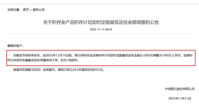 财经通讯社11月11日报道(记者邹俊涛)国际金价重回4100美元后,银行也随之调整公积金相关业务门槛。 11月11日,中信银行发布公告称,为适应市场形势变化,自2025年11月15日起,定期存款计划最低调整投资金额由1000元调整为1500元。定期积累计划最低固定投资权重不变,最低存款额仍为1克。中信银行公告截图当天(11月11日),中国建设银行公告称,为保护投资者权益,修订了《中国建设银行个人黄金积累业务产品介绍及交易规则》,分析涉及交易行情、大额赎回等项目。新版本的文字将于2025年11月15日(星期六)正式上线。其中,黄金积累计划的每日积累起点由此前的1000元提高至1200元。中国建设银行公告截图。值得注意的是,两家银行调整存款业务门槛的时机恰逢国际金价上涨。接受采访的业内人士认为,从银行业近期的一系列动作来看,很可能会提高公积金相关门槛,以防范黄金市场风险。金价恢复上涨趋势后,银行重新调整了业务相对门槛。近期,贵金属期货有所反弹。 Wind数据显示,隔夜市场,现货黄金上涨近3%,触及4120美元/盎司关口。截至11月11日中午,伦敦金攀升至4140美元/盎司。同时,国际金价再度上涨,多家银行宣布调整公积金相关业务门槛。中信银行今日宣布,拟将固定投资最低存款额提高至1500元。据了解,2024年3月,中信银行将定投存款最低存款额由500元调整为1000元。此时,中信银行时隔20个月再次提高相关门槛。如此安排的具体考虑是什么,是否能作为锡与金价新一轮上涨的一线之隔。 11月11日上午,财联社记者采访中信银行,但截至发稿尚未得到回应。与此同时,中国建设银行今日公布了新修订的《中国建设银行个人黄金积累业务产品介绍及交易规则》,并宣布计划进一步增加个人黄金积累业务定期积累起点为1200元。建设银行计划进一步提高个人业务定期积存金积累起点至1200元。这是建行今年第二次调整相关门槛。今年4月,中国建设银行宣布,自2025年5月6日起,定期积累个人业务黄金积累(包括日均积累和可选日积累)起始金额由800元提高至1000元。此外,10月24日,交通银行在官网宣布,自2025年10月27日9时30分起,该行“贵金属钱包”累积计划起始值调整为“浮动金价”模式。不过,财联社记者查看了央行官网公告栏。今天f通讯,发现相关公告不再显示。具体原因是什么?财联社记者随后采访并咨询了交通银行,截至发稿未获回复。 “近期黄金市场交易活动有所回升,转账银行的目的是控制潜在的风险敞口。”盘古智库高级研究员于丰辉对美联社记者表示,由于金价波动加大,提高定投起点可以有效筛选客户,减少中小投资者追涨杀跌造成的非理性交易行为。经过多轮调整,银行公积金最低购买门槛再创新高。值得一提的是,今年以来,银行公积金最低购买门槛不断提高。y创历史新高,且增长速度加快。尤其是今年三季度以来,更是突破了1000元、1500元两个关口。据了解,今年3月份以来,建设银行、光大银行、招商银行等进入下半年,相关申购门槛进一步提高。 9月22日,兴业银行宣布,将根据规模调整活期和普通定期业务累计存款申购门槛值。按量交易时,单笔申购和新增定投申购起价由900元调整为1000元。 10月11日,工商银行宣布,自10月13日起,如意金积存业务最低投资金额(即积存起始金额)由850元提高至1000元。此外,宁波银行还宣布,自2025年10月11日起,累计押金申购最低金额由900元调整为1000元,按重量最低申购金额维持1克不变。如果购买金额低于1000元,则交易申请未成功提交。公开信息显示,中信银行此次将最低存款额定为1500元后,行业最低申购门槛再创新高。