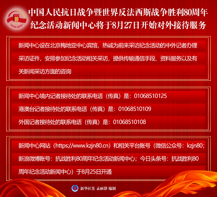 新华社,北京,8月24日。记者从相关政党那里获悉,新闻中心纪念中国反对日本入侵的外国战争胜利80周年,世界反法西斯主义战争将于8月27日开始外部接待处。新闻中心位于北京的媒体中心酒店。针对正在采访活动的中国记者和外国人的访谈文件进行热门处理,组织与事件事件有关的访谈,并在新闻访谈中提供沟通方法,信息服务和咨询。新闻中心记者接待处的ANG联系电话(传真)为:01068510125; Hong K的记者接待处的联系电话(传真)ONG,澳门和台湾为:01068510109; The contact number (fax) of the Foreign Journalist Reception Office is: 01068510108. The News Center website (https://www.kzjn80.cn) and relevant platform accounts (WeChat official account: KZJN80; Weibo Account: News Center for 80th Anniversary of Anti-Japanese War; Headline Account: News for 80th Annivery of the Anti-Japanese War; The website will immediately release新闻,公告,通知等新闻中心组织的访谈,提供基于知识和背景材料,并为中国和外国记者提供访谈服务。